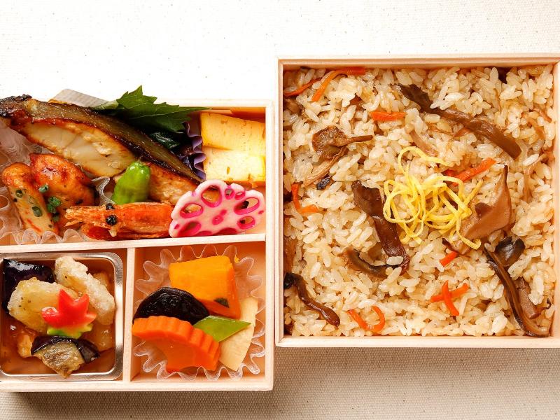 季節の炊き込みご飯、メダイ西京焼き、しし唐、甘えび唐揚げ、豆腐しんじょう、卵焼き、カレイと豆腐のおろし餡かけ、煮物、お漬物
